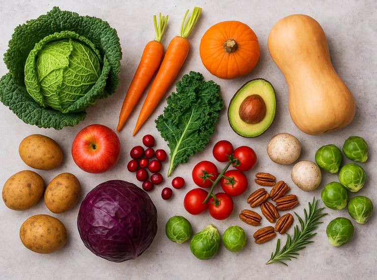 Brussels sprouts, cabbage, cauliflower, kale, leeks, parsnips, carrots, potatoes, beetroot, swede.