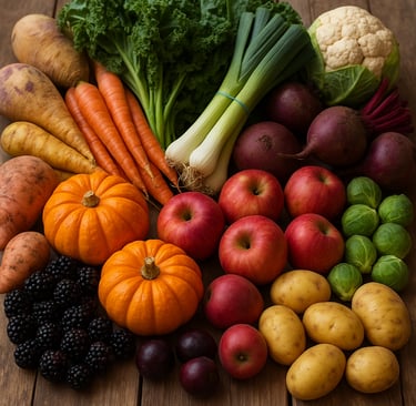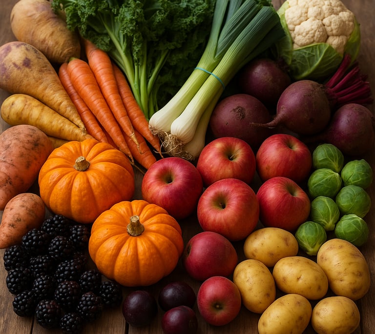 Vegetables: Leeks, carrots, cabbage, parsnips, pumpkins, turnips, cauliflower, kale, and squash.